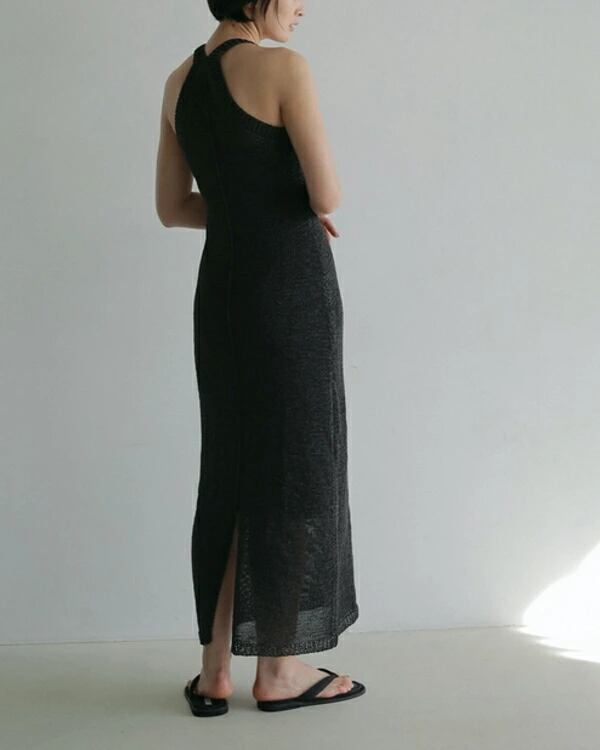 ツヤ感のあるストローヤーンでざっくりと編み上げたニットワンピース。