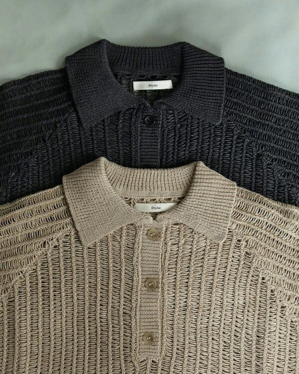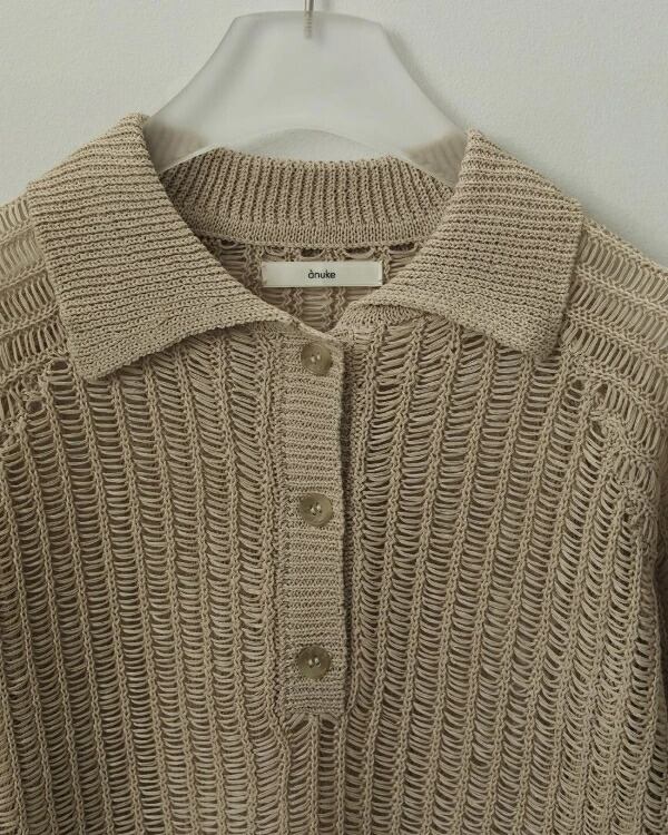 カジュアルなポロシャツデザインを透け感のある編み地とショート丈で仕上げることで、旬のエッセンスを効かせた一枚に。