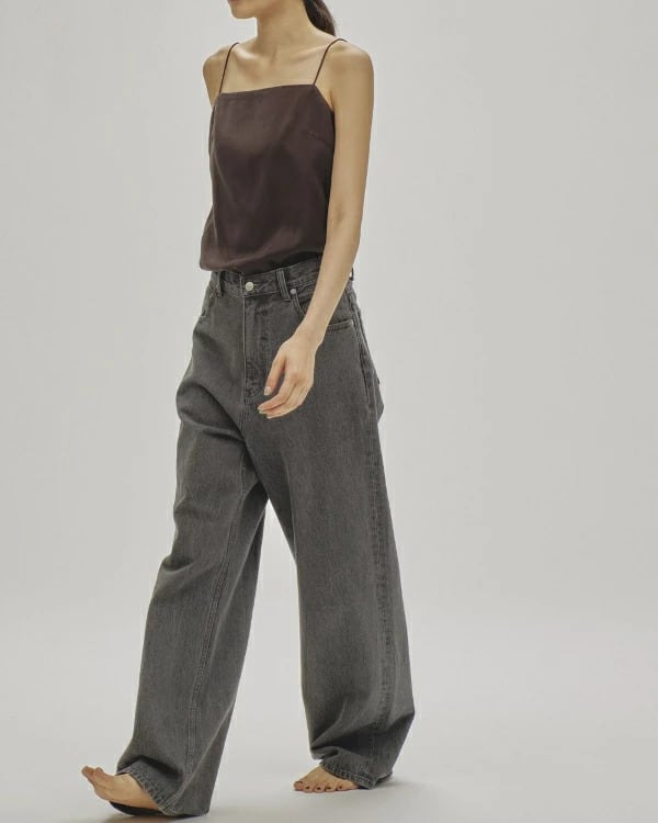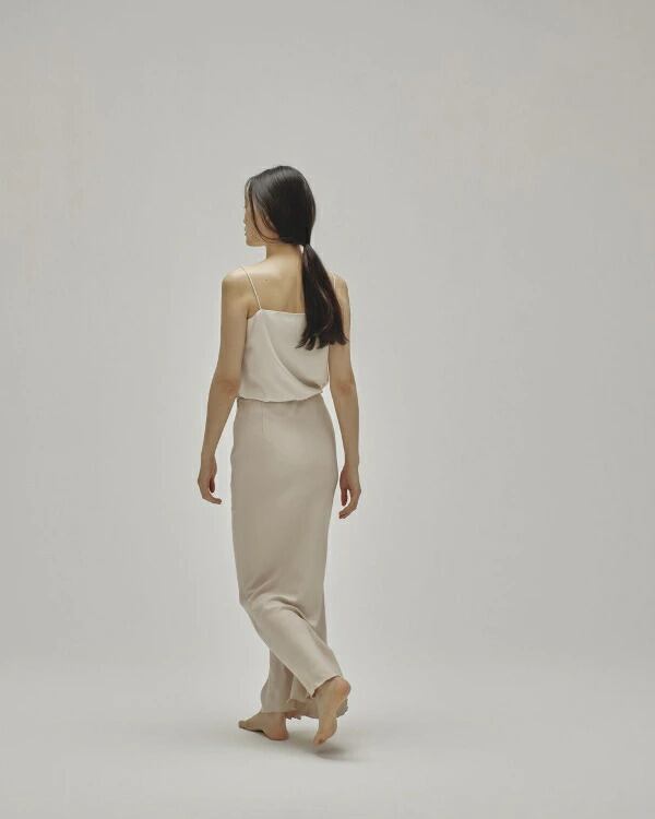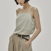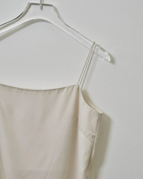 滑らかな肌触りと程良く落ち感があるサテン生地を使用したキャミソール。