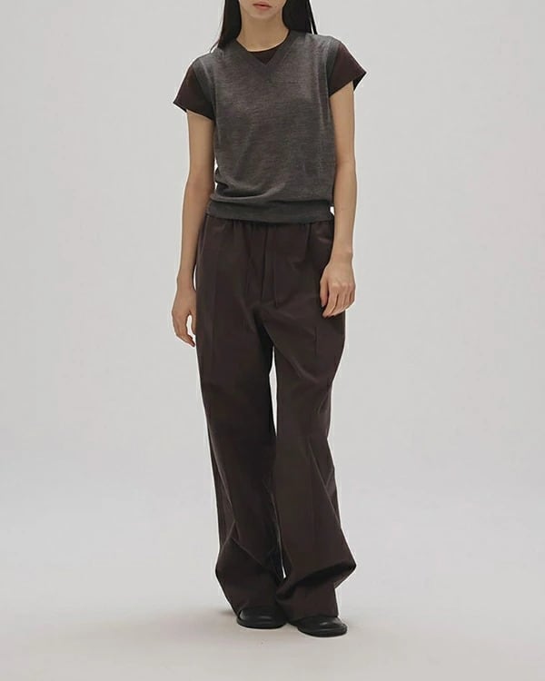 センタープレス見えのピンタックが縦のラインをすっきりと見せ、カジュアルなウエストデザインが程良い抜け感に。