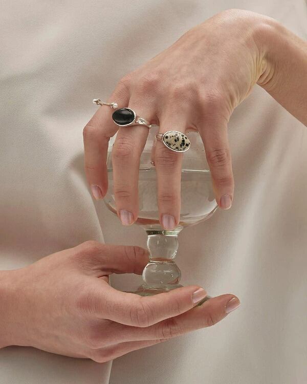 指を細く綺麗に見せてくれるディテールで、バーのサイドにさりげなくあしらったパールが目を惹くアイテム。