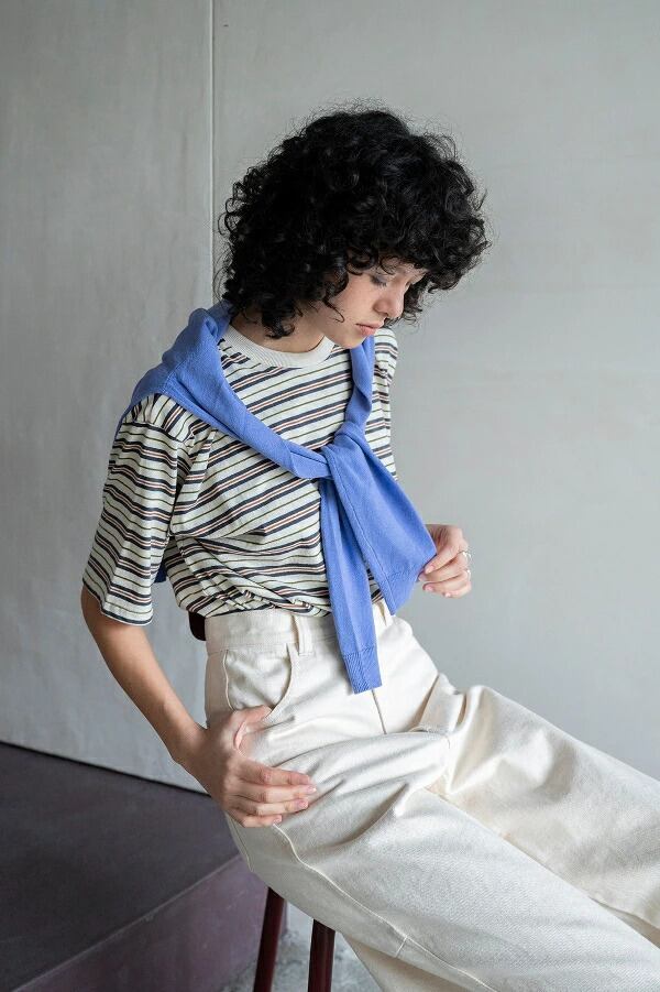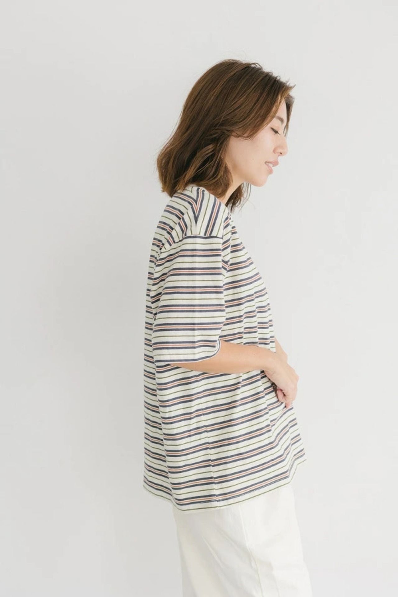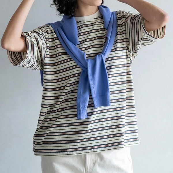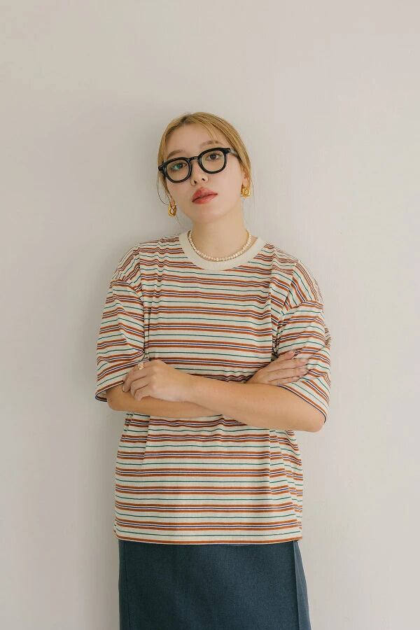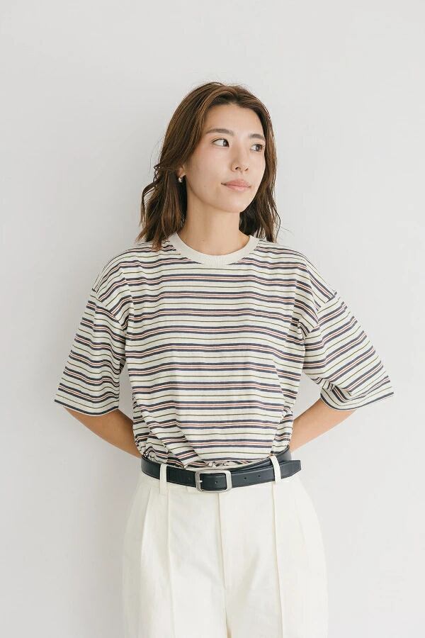 ベーシックで使いやすいゆったりシルエットのTシャツ。 コーディネートのアクセントとして使えるマルチボーダー柄を採り入れました。