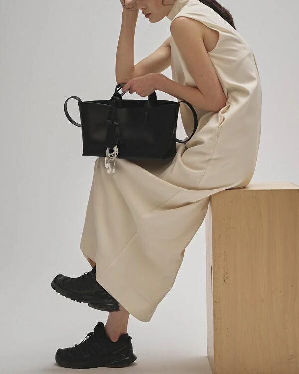 同じ素材で仕立てた鍵などを付けられるチャームやボックスシルエットのボディが目を惹くアイテム。