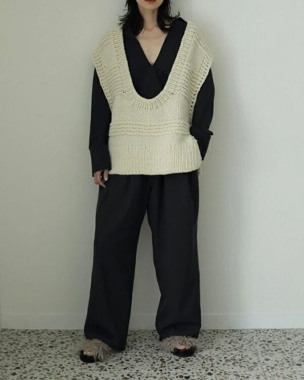ストレッチ性のある平織りの杢調素材で仕上げたワイドパンツ。