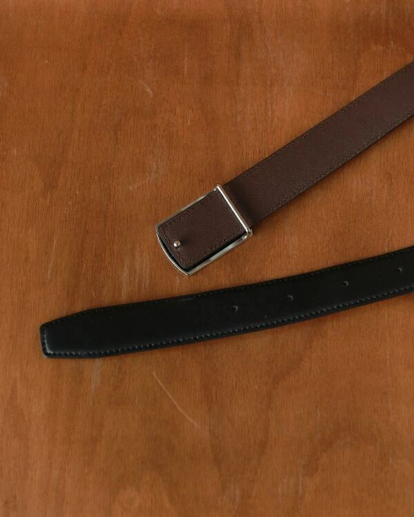 取り外し可能なフロントバックルで、リバーシブルに使用できる2WAYベルト。