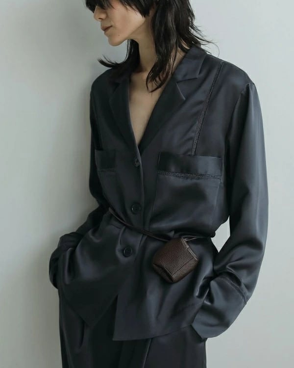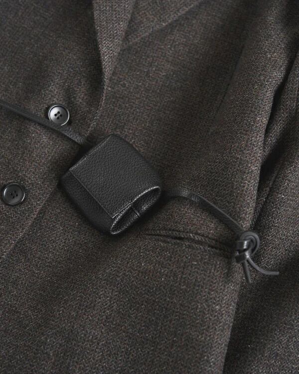 2タイプの共布紐付き。長い紐は、首からかけたりウエストに巻いたり、スタイリングのアクセントとしておすすめ。
