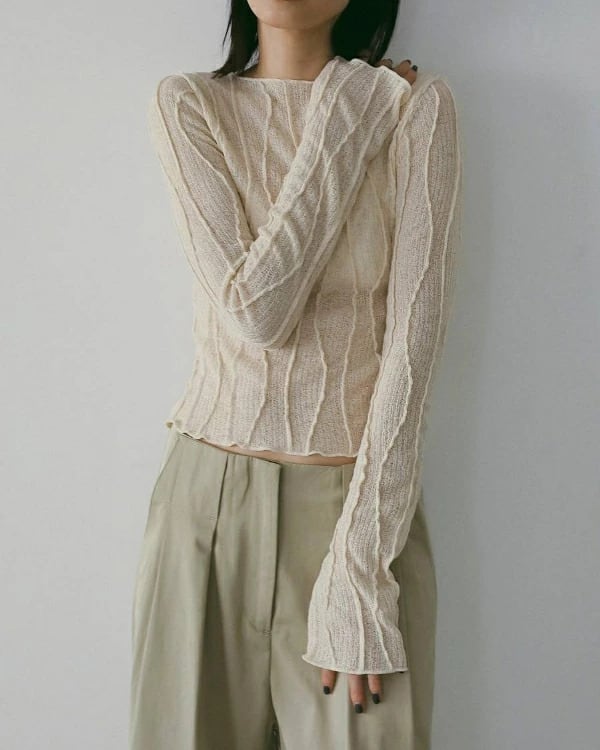 ランダムに施したピンタックが表情を生む、ニットライクな素材のコンパクトトップス。