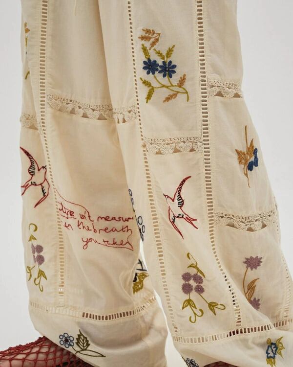 13種類もの刺繍をふんだんにあしらったパッチワークが目を惹くトラウザーズ。
