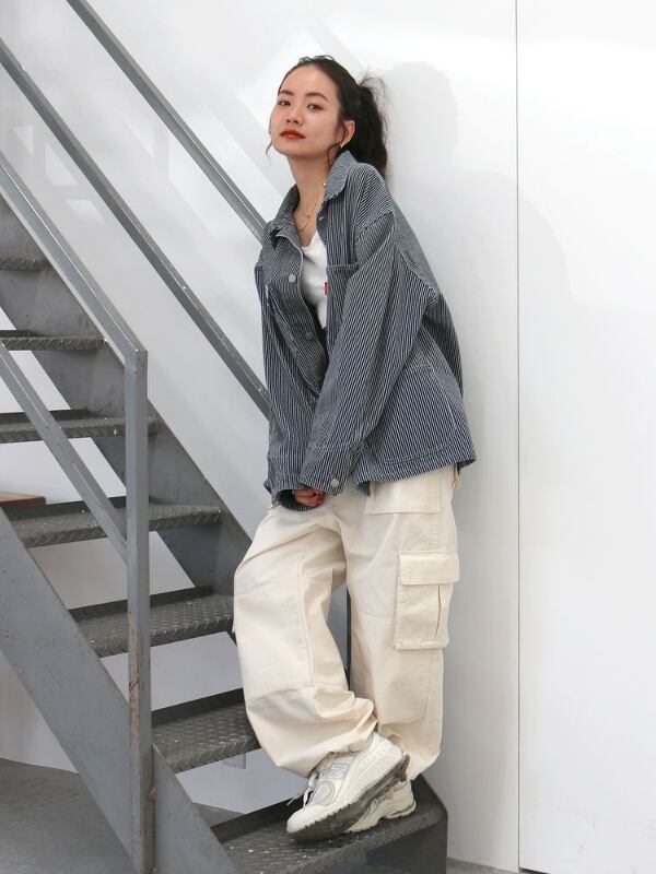 カジュアルなトップスとの合わせでメンズライクなスタイリングがオススメ。