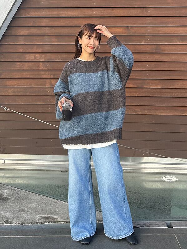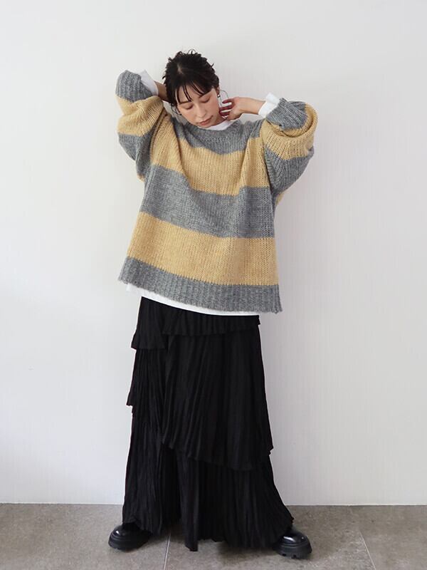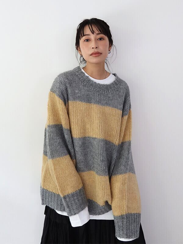 柔らかく太めな糸でざっくりと編み立てたボーターニット。