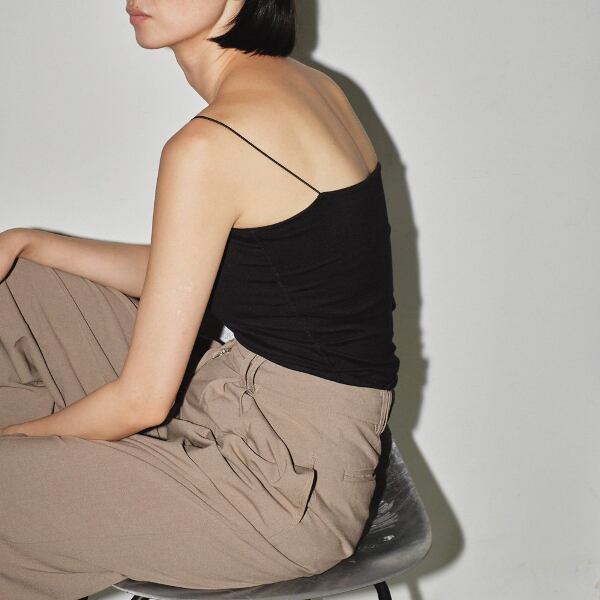 華奢なストラップと、直線的なネックラインがヘルシーな印象に。